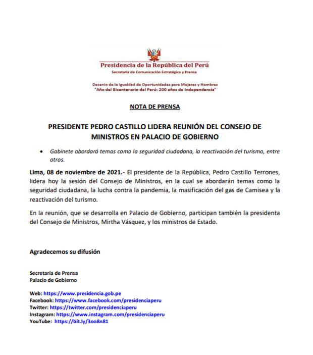 Esta mañana, Pedro Castillo, presidente de la República, lidera una nueva sesión del Consejo de Ministros, junto a la titular del Gabinete, Mirtha Vásquez, y otros ministros. La reunión tiene lugar en Palacio de Gobierno.