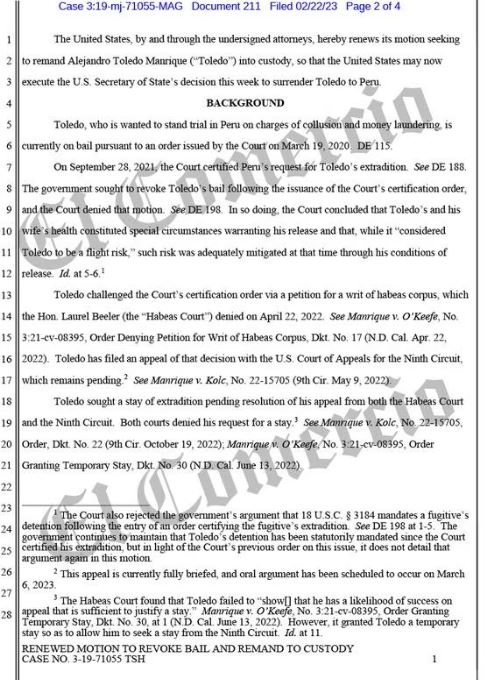 Según el documento judicial del gobierno estadounidense, Alejandro Toledo “debe ser detenido para que el gobierno pueda efectuar su entrega a las autoridades peruanas”.