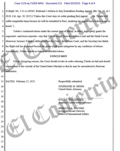 Además, dicho documento señala que Estados Unidos busca la prisión preventiva contra el expresidente para que ese país “pueda ahora ejecutar la decisión del secretario de Estado de Estados Unidos esta semana de entregar Toledo al Perú”.