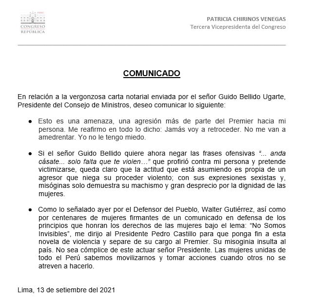 Luego de que la tercera vicepresidenta del Congreso, Patricia Chirinos indicara el pasado domingo que el Presidente del Consejo de Ministros, Guido Bellido le envió una carta notarial para que rectifique sobre sus "afirmaciones" en su contra, la Parlamentaria emitió un pronunciamiento.