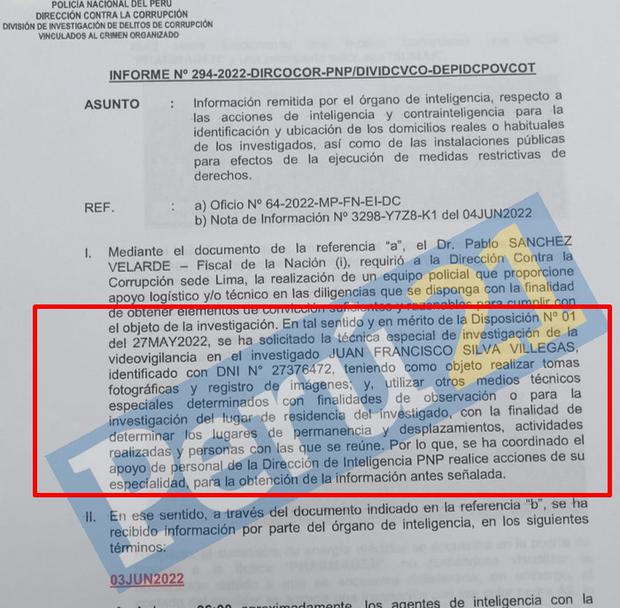 “En mérito a la Disposición N°01 del 27MAYO2022, se ha solicitado la técnica especial de investigación de la videovigilancia en el investigado Juan Silva Villegas, (...) teniendo como objeto realizar tomas fotográficas y registro de imágenes; y utilizar otros medios técnicos especiales determinados con finalidades de observación o para la investigación del lugar de residencia del investigado, con la finalidad de determinar los lugares de permanencia y desplazamientos, actividades realizadas y personas con las que se reúne”, se lee en el informe.