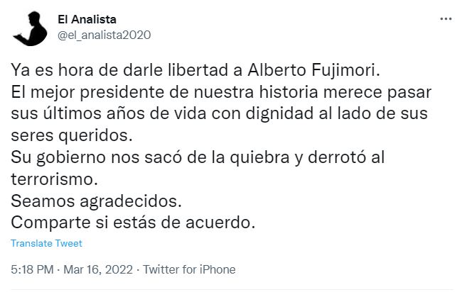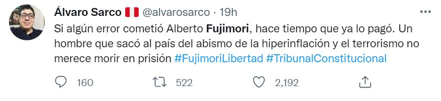 Tras la ratificación del indulto al expresidente del Perú, Alberto Fujimori Fujimori, muchos simpatizantes del exmandatario expresaron su conformidad con la desición del Tribunal Constitucional en la redes sociales.