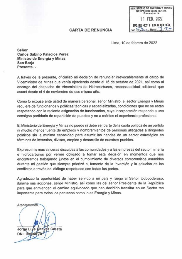 Tras el nombramiento de Carlos Palacios Pérez como el nuevo ministro de Energía y Minas, Jorge Luis Chávez Cresta presentó su carta de renuncia irrevocable al cargo de viceministro del sector y señaló que se ha comenzado a designar a funcionarios respondiendo a una “consigna partidaria” como parte de una cuota política.