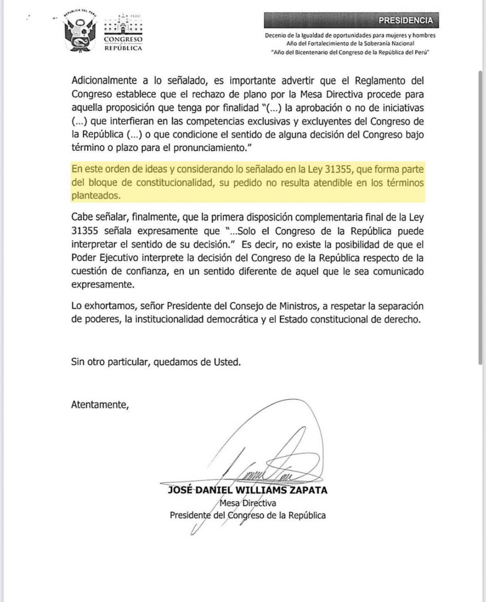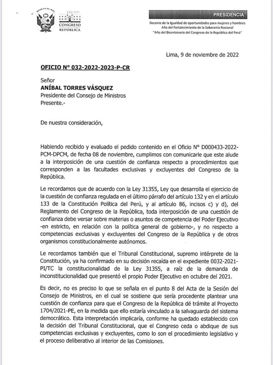 “Habiendo recibido y evaluado el pedido conteniendo en el Oficio N| D000433-2022-PCM-DPCM, de fecha 08 de noviembre, cumplimos con comunicarle que este alude a la interposición de una cuestión de confianza respecto a procedimientos que corresponden a las facultades exclusivas y excluyentes del Congreso de la República”, se lee en el documento.