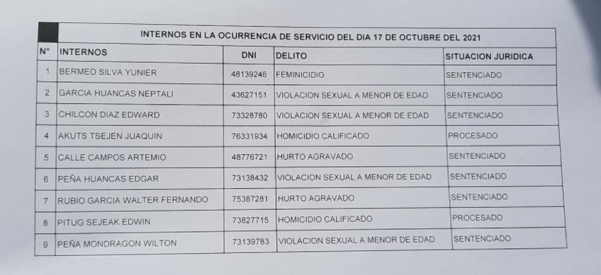 Se trata de los internos: Yunier Bermero Silva, Neptalí García Huancas, Eduardo Chilcón Díaz, Juaquin Akuts Tsejen, Artemio Calle Campos, Edgar Peña Huancas, Walter Fernando Rubio García, Edwin Pitug Sejeak y Wilton Melgar Peña Mondragón.